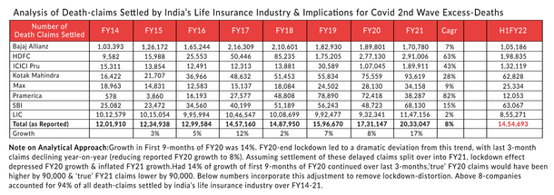 Since baseline is supposed to incorporate pre-covid trend, this analysis ignores covid/lockdown-distortion. Pre-covid trend corresponds to ~1.8 million death-claims in FY20 and FY14-20 growth rate of 7 per cent a year.