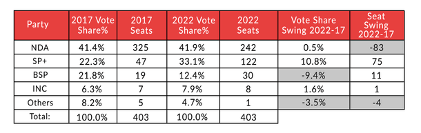 A new, detailed opinion poll, on the prospects of political parties in the forthcoming Uttar Pradesh assembly elections, was released by Times Now-Polstrat this week. It forecasts a comfortable return of the National Democratic Alliance (NDA), led by the Bharatiya Janata Party (BJP) and sitting Chief Minister Yogi Adityanath.