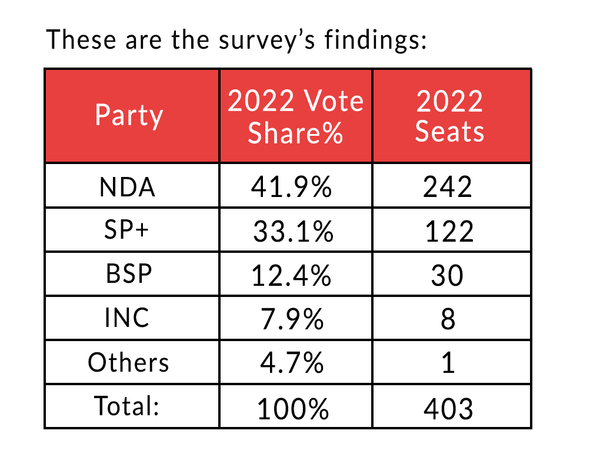 So, prima facie, a survey giving 122 seats to the SP with a third of the vote share seems legitimate, since there could be a clustering of wins in step with the demographic spread (which is a polite way of saying that if the SP is basing its prospects on the rank identity vote, then yes, it will get more seats because of the concentration of its vote banks).