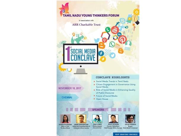 The Tamil Nadu Young Thinkers Forum (TNYTF) is organising its 1st Social Media Conclave in association with the ARR Charitable Trust with an aim to elevate the quality of public discourse in Tamil Nadu as well as the country.