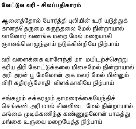 In this vast work, are three noteworthy musical segments — Aaichiyar kuravai (the dance of the cowherd women (gopis) ), Vettuva vari — the song/dance of the hunter-folk and the Kurinjippattu; while the Kuravai is in praise largely of Krishna (and the various avatars of Vishnu such as Rama, the slayer of Ravana), the Kurinjippattu is in praise of Murugan, the Vettuva vari is in praise of Kottravai or Durga (in addition of course to the kAnal vari and the ArangEtra kAthai).
