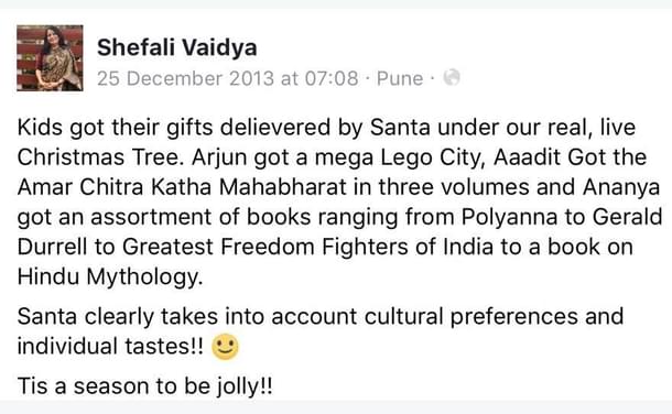 In fact, once, I too was a lot like you, believing in the myths of ‘love, sharing and caring’ during Christmas. I even proudly declared on Facebook once that Santa gifted my children books on Hinduism for Christmas! I haven’t deleted that post as it serves as a reminder to me about my own naïveté.