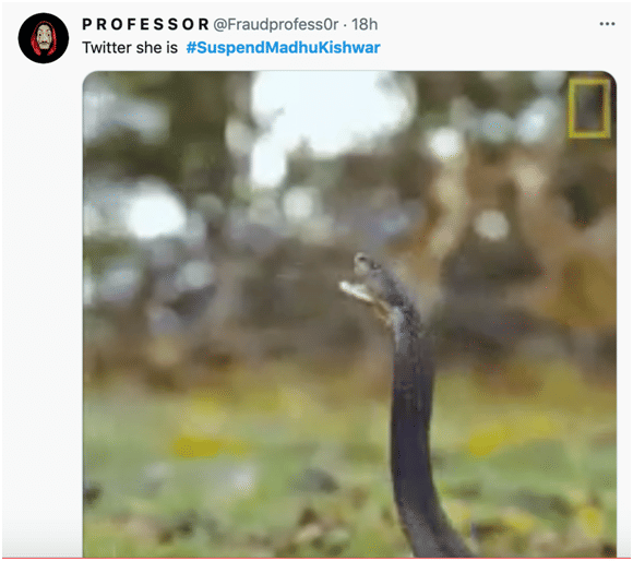 Point to Note: She is blindly following the spoon-fed script of hate against me, as part of a concerted campaign without any provocation from my side. PROFESSOR @Fraudprofess0r like several other trolls posted GIF (Graphics Interchange Format) of a poisonous snake and call me a ZehreeliNaagin.