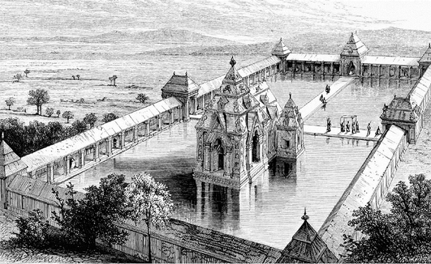 The Mārtanḍa temple is one of the most beautiful temples ever designed. Built of stone, it is characterised by the simplicity of its design, a hallmark of Kashmirian art and architecture. The temple is rectangular in plan, consisting of a maṇḍapa and a shrine. Two other shrines flank the maṇḍapa. It is enclosed by a vast courtyard by a peristyle wall with 84 secondary shrines in it. The columns of the peristyle are fluted. Each of the 84 niches originally contained an image of a form of Sūrya. The number 84, as 21×4, appears to have been derived from the numerical association of 21 with the sun. Below is also the restored impression of the temple from Letters from India and Kashmir by J. Duguid, 1870-73.