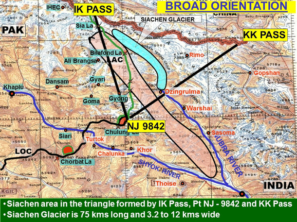 The location of Siachen Glacier needs a geo strategic-analysis afresh. The wedge of territory between NJ 9842, Karakoram Pass and the Shagsgam Valley is the bone of contention (see map).