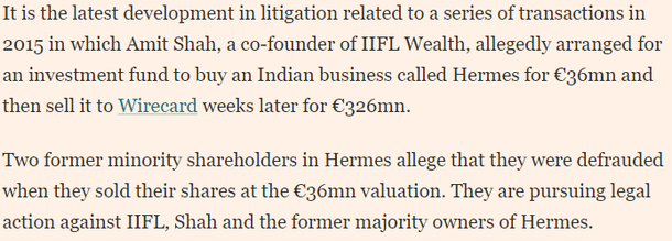 The crux: Amit Shah, a co-founder of a company called IIFL Wealth (now supposedly renamed 360 One), allegedly arranged for a company to be purchased for X amount, and just weeks later have it sold to Wirecard for 9X.