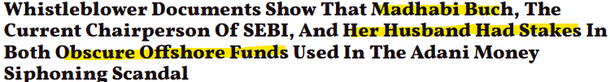 In the background to the report, HR alleges the lack of adequate action against the Adani Group by the Securities and Exchange Board of India (SEBI). It then appears to attribute this to some connection between the current SEBI Chairperson, Madhabi Puri Buch (MPB), and the Adanis. I quote from the report: