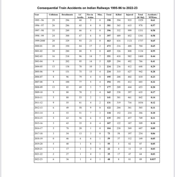 On the basis of the number of incidence of train accidents per million train kms, while the UPA-era saw it decrease from 0.29 in 2004-05 to 0.10 in 2013-14, during the current NDA-rule, it has reduced from 0.11 in 2014-15 to 0.037 in March 2023.