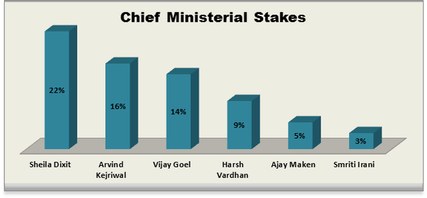 *Shiela Dikshit remains the popular choice for Chief Ministerial seat at 22% followed by Arvind Kejriwal at 16%.Vijay Goel is the preferred choice from BJP for CM post.36% of BJP voters want Vijay Goel as next CM of Delhi