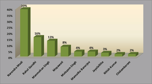 *Modi is the most preferred choice for PM post at 39% followed at distant second by Rahul Gandhi.Modi more popular among first time voters, young college goers, women and middle class