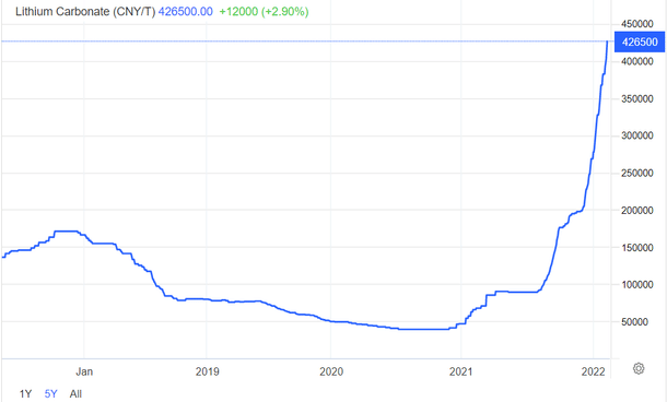 Price of Lithium carbonate in China extended its rally to 426,500 yuan/tonne in mid-February, marking a gain of 50 per cent so far in 2022. This translates to a whopping price increase of more than 400 per cent from 2020 and is attributed to an imbalance in global supply amid huge demand.
