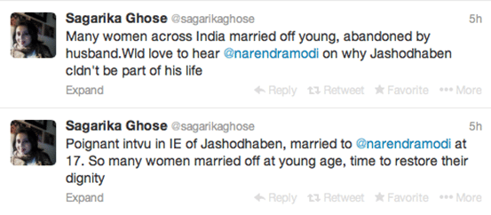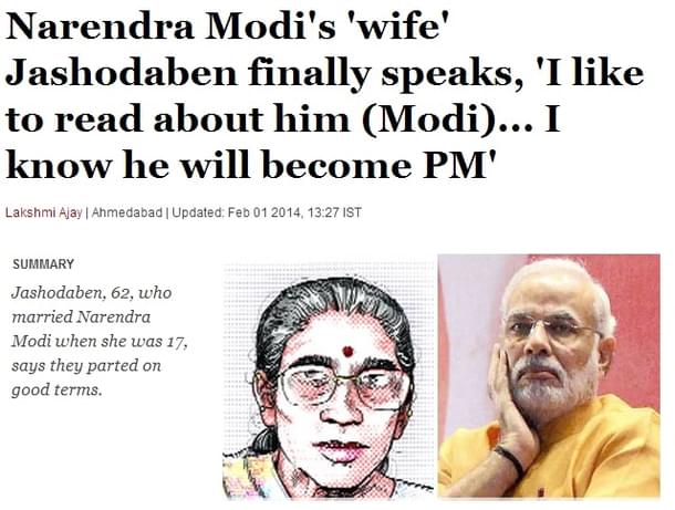 Indian Express interviewed Narendra Modi’s “wife” Jasodaben recently. As the interviewer stated, the lady “who married Narendra Modi when she was 17, says they parted on good terms”, over 40 years ago. From the interview, it is evident that after an amicable separation, the lady went on to lead an independent, single life, and bore no grudges. She is clearly a Modi supporter and wishes him success. In fact, she states “I know he will be PM one day!” Yet, sections of the media have suddenly appointed themselves her champions, and are busy trying to teach Modi moral science lessons. Here is a set of tweets by the man who set this distasteful discourse rolling: