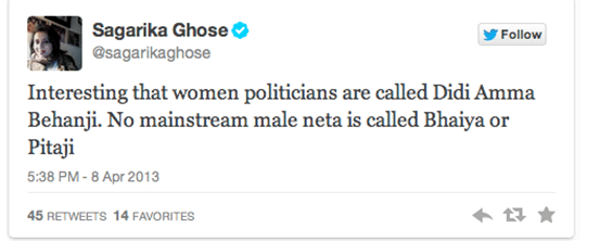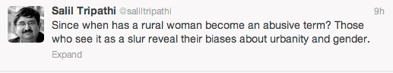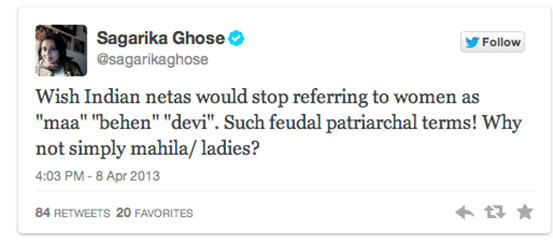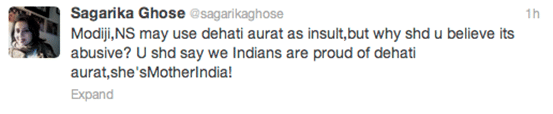 So, Ms. Ghose would have us believe that referring to a woman a mother or sister is somehow insulting to womanhood, but referring to our male Prime Minister, as a village woman is kosher?