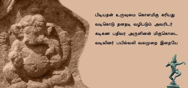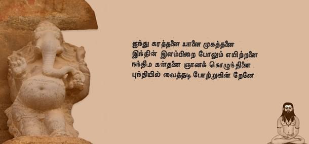 The most popular Ganesha hymn that a child learns in Tamil Nadu is the famous Ainthu Karathanai. It is an invocation at the beginning of the spiritual masterpiece Thirumanthiram. Though the scholarly opinion is that it was not composed by Thirumoolar, the author of Thirumanthiram, the invocation hymn is considered an integral part of the text.
