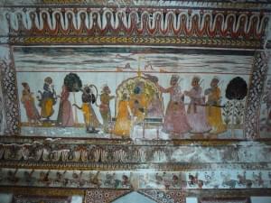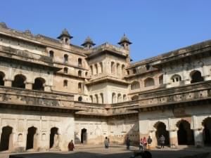 The Raja Mahal palace is located exactly opposite the Chaturbhuj temple so that the first thing the queen saw upon waking was the Lord in the temple. There are a few murals that still survive and attest to what must have been a very beautiful palace overlooking the river. The palace is probably a perfect square and combines elements of Mughal and Hindu architecture in its lattice work and chhatris.