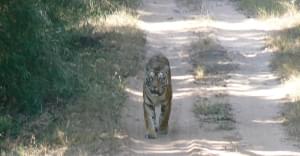 We hammered the brakes and skid to a halt, the driver furiously shushing the couple of ladies chattering away gaily in our jeep. From up ahead, another Gypsy approached and the idiots started yelling at us to give way! In the commotion, the tigress slunk back into the vegetation and I was left cursing the Bongs in the other Gypsy. Again, luck favoured us – after the other jeep went away, the tigress came out again, barely 10 metres from us, and for 30 seconds or so, allowed us marvel her gait and power.
