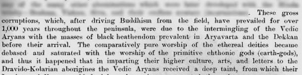 Thomas Huxley, a British biologist wrote in 1890: “So far as India is concerned, the internal evidence of the old literature sufficiently proves that the Aryan invaders were "white" men. It is hardly to be doubted that they intermixed with the dark Dravidian aborigines; and that the high-caste Hindoos are what they are in virtue of the Aryan blood which they have inherited, and of the selective influence of their surroundings operating on the mixture.”