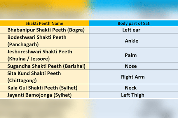 It is mentioned in Tantra Churamani that Goddess Sati's palm fell at Jessore Satipeeth (also a Shakti Peeth) in Bangladesh and that the Goddess here is Jeshoreshwari and Rakshak Bhairava is Chanda Bhairava.
