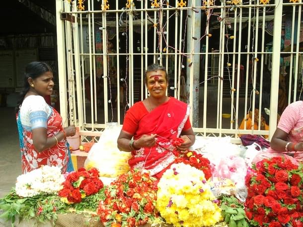 Not too far from where I stay is a Shiva temple. There have been plenty of times when I have crossed the temple premises, sent in a silent prayer or walked around the area watching idly as a constant stream of devotees entered and exited the temple with fervent prayers. It was another of those days when my evening walk took me close to the temple and even as I was about to cross the road that led to another small connector, my eyes fell on ‘her’. Red sari, good hair tied in a magnificent bun, a large maroon bindi, dazzling smile and yarns of Jasmine garlands in her hand, she sat like some terrific Shiva incarnate. I stopped on the edge of the road and watched her from a distance.