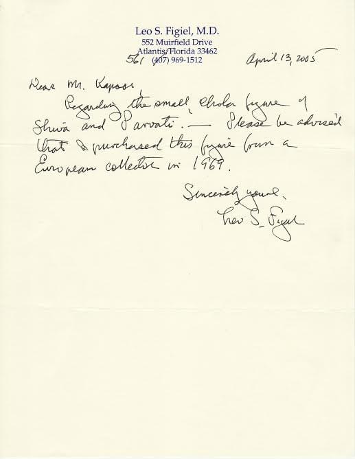 We can now reveal more information as to why the museum has changed its stand, with information obtained from persons who are in the know of the Kapoor operations. The bronze has an apparent provenance paper authored by the previous owner Dr. Leo S. Figiel dated April 13, 2005, where he claims to have purchased “the small Chola figure of Shiva and Parvati – from a European collector in 1969”. (Dr. Leo Figiel, was a well known collector of Indian vernacular art ( is now deceased – died Feb 2013) and is now suspected of having a working arrangement with Subhash Kapoor’s activities.)