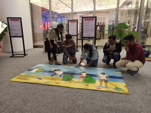 Many were clicking pictures of the installations. Some were writing their answers on the hanging notes, trying the balancing act on the seesaw, solving the jigsaw puzzle, and listening to the speaking tree.