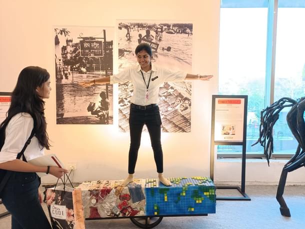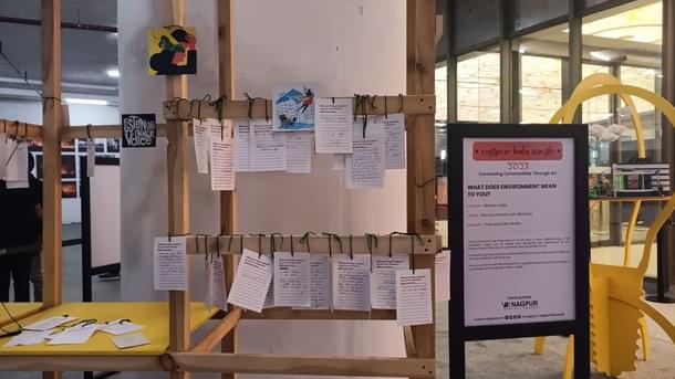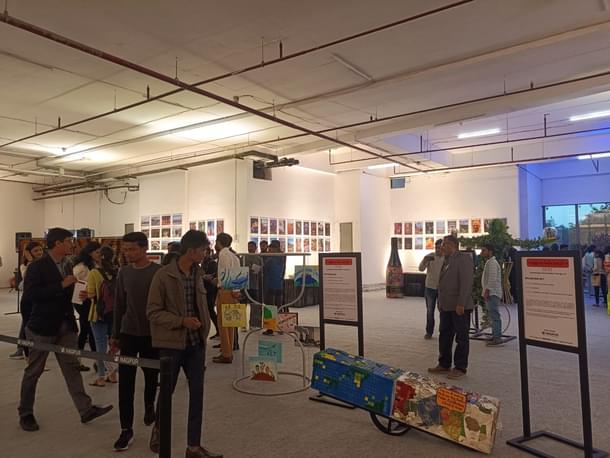 Sushmita and Raashi, who have displayed an hourglass representing a fine balance between human beings and the environment at the festival, say that they enjoyed the whole process of making it together and are overjoyed to see so many visitors of all ages spending some time looking, reading, and even asking them to explain about their art.