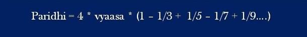 To calculate the circumference (paridhi) of a circle, said Madhava, we must multiply the diameter (vyaasa) by four times one minus tri-sharaa-aadi-vishama-samkhyaa-bhaktam-rNam. A phrase of compactness, which Aryabhata would have enjoyed. In other words, a sequence of odd (vishama samkhyaa) denominators (bhaktam) starting (aadi) with three (tri) and five (sharaa). The word sharaa here is a bhutasamkhya (see third essay) word for the five arrows of Manmatha, whose archery takes precedence over Rama and Arjuna and even Tripurantaka, in this case.