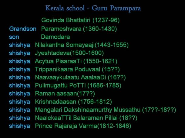 Shortly after Aryabhata, a mathematician called Haridatta had composed a work title Parahita Ganita based on Aryabhatiyam. After that we seem to have a vacuum in Kerala until Madhava (c 1340 AD) of Sangamagrama (Kudalur in Malayalam). What followed is an astonishing continuity of the guru-shishya parampara from Govinda Bhattatiri to Rajaraja Varma.
