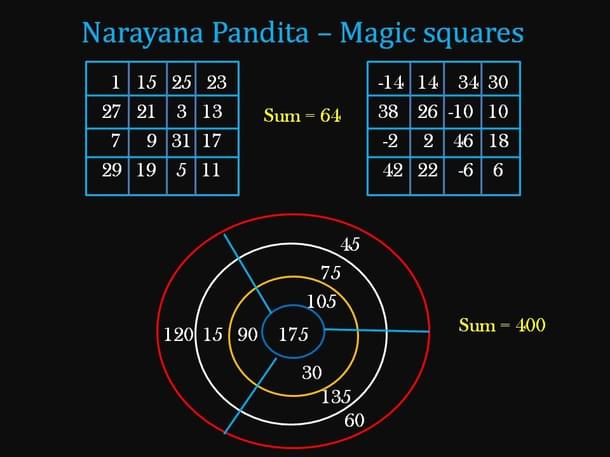 His famous novelty was magic squares, squares filled with numbers so that each row and column add up to the same number. He explained procedures to create magic squares of desired sizes, how to fill them up for a given total, and certain fascinating variations, including use of negative numbers.
