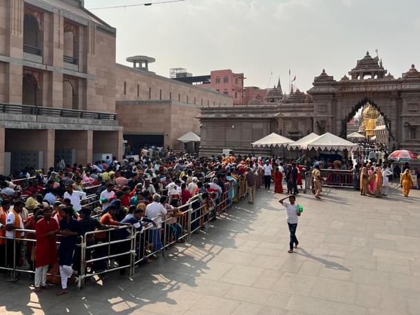 The pilgrims had queued up at the first security check after having deposited their phones and valuables and had the replica of the main shrine, the Chandragupta Mahadev Mandir for a backdrop.