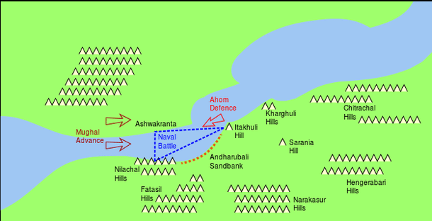 It was in such a dire situation that Lachit showed his tactical brilliance. Knowing very well that the Ahoms had no chance in an open field battle, he chose Guwahati with its hilly terrain. The only way up to Guwahati from the east was the Brahmaputra river. It was at Saraighat, where the Brahmaputra was at its narrowest point - just a width of 1 km - ideal for naval defence. While the Mughal army was the strongest on land, especially in open plains, their weakest point was their navy. Lachit set up a series of mud embankments in Guwahati and ensured that the Mughals would be forced to take the river route to the city. Andharubali,between Kamakhya and Sukreshwar hills, was where Lachit would set up his headquarters and monitor the war operations.