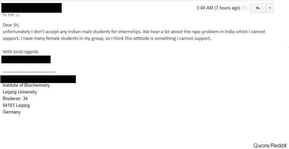 An email from professor Annette G Beck-Sickinger posted on Quora said: “Unfortunately I don’t accept any Indian male students for internships. We hear a lot about the rape problem in India which I cannot support. I have many female students in my group, so I think this attitude is something I cannot support.”
