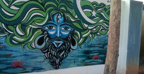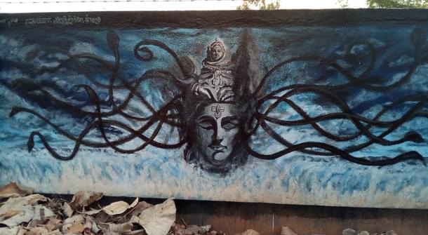 And the geography of India fuses with the face of Shiva with even the Pakistani flag-like crescent moon and star adorning his matted hair.