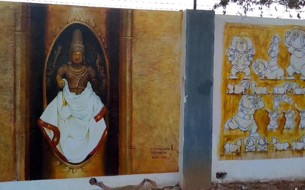 In the panel below, one can say the artist is from Kumbakonam as the painting shows a Shiva temple with sharp features. Here, the Lingothbava is depicted. The adjacent panel (captured here partially) shows the line drawing various Shiva Ganas – his hordes.