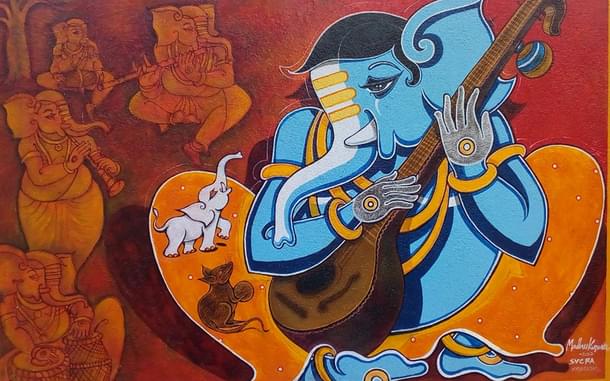 This panel shows a Veena-playing Ganesha. In the background are other Ganeshas with all the musical instruments, even as an elephant calf looks lovingly at the deity.