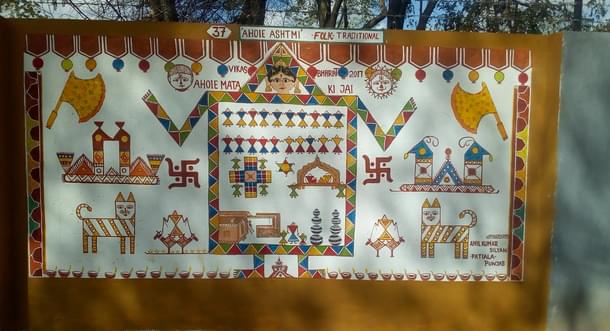 Here is another folk painting from Punjab and showing the Ahoi Ashtami celebration before Deepavali. Ahoi is a goddess, and she takes care of the welfare of the house and children. And here in this painting, she fuses seamlessly with Mother India.