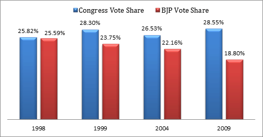 Recently the number of voices even in the neutral territory of the political divide have increasingly started to propose that Congress would be reduced to 100 odd seats or even below to a double-digit nadir. The same voices are also proposing a BJP revival of sorts, two of the latest examples of this new school of thought are Swaminathan Ankleshwar Aiyer of the Swaminomics fame and Minhaz Merchant of the Global Intelligence review (both, significantly of the TOI ecosystem). There are inherent flaws in such analysis which cannot be ignored while arriving at the final conclusion. First let us look at the national vote share of both the parties.