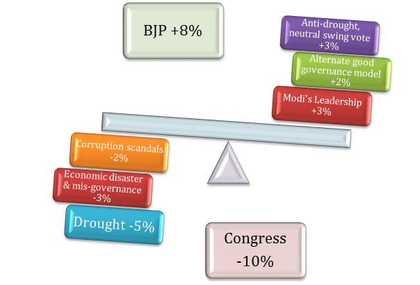 If the national general elections are held in the next year or so then drought would definitely leave its mark on the outcome of the polls. A combination of bad governance, corruption scandals and massive economic mismanagement combined with the most important factor of drought could give Congress a deathblow of a 9-10% away swing and reduce it to the depths of double-digit ignominy. If the BJP can project development politics and effective governance as the alternative model under the leadership of Narendra Modi then it can gobble up at least half of that 9 % away swing from the Congress party, when coupled with additional neutral voters and re-enthused middle class under NAMO, that “for” swing can hit the deadly 8% mark, to hit a double century. (The one possible roadblock for such a model is of course the “Muslim Vote” which could rally against BJP, and for Congress – we shall see more about that some other time.) It is now all in the realm of possibility, can BJP rise up to the occasion?