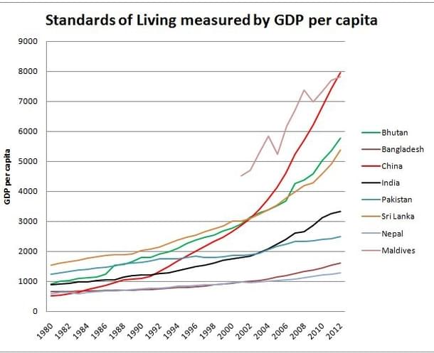 GDP per-capita tells us that if the goods and services produced within the country are divided equally amongst its citizens, how much each citizen would get. It is a commonly used to compare the standard of living across different countries.The graph below shows where Indians stands in comparison to its neighbors since 1980.