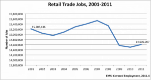 But do big-box stores really reduce retail employment? This study published by the Cato Institute refutes the claim. Take a look at the analysis conducted using a wide variety of data to arrive at the final conclusion. Let’s look at it in another way. The study conducted in Chicago claims that each Wal-Mart job costs 1.4 retail jobs. Wal-Mart employs 1.4 million in its various US stores at an average rate of 325 employees per store. That means unemployment due to Wal-Mart alone is 1.96 million (1.4 million x 1.4). The total unemployment in US is 12.5 million. So, Wal-Mart alone accounts for 15% of the 12.5 unemployed people in the US? Now add similar unemployment caused by other big box stores and you will see how unbelievable these numbers seem to be. Also, if big-boxes really hurt employment, the US’ national retail employment numbers should show a perpetually downward trend over the years in the Big-Box country US has become. However, that is not the case even after accounting for the onslaught of online retailers like Amazon who eliminate the need for physical employment (which is good for the economy just like automation). As you can see from the chart below, retail employment has dipped only around the two recessions, 2002-03 and 2008-10 and has picked up after the recessions are over. Also, according to the same source, even in the land of big-boxes, and even after a devastating economic meltdown of 2008, jobs in Fruit and Vegetable markets declined 19% while jobs at convenience stores (American Kiranas, i.e. direct competitors of Big-Boxes) declined only 4%. Now compare that with the claim that Wal-Mart will make 12 million Indians jobless. Remember, Wal-Mart along has 4300 stores in the US. How many stores do you think it will take to render 12 million Indians jobless? Let’s do the math. Each Wal-Mart store employs approximately 325 people, which means, each store makes 455 (325 x 1.4) people jobless. We will need a whopping 26,373 WalMart-like Big-Box stores across India to put 12 million people out of jobs (ignore the fact that others will find employment at these stores). Another important trivia, Wal-Mart has built 4300 stores in the most developed & consumer driven country in the world and it took them 50 years to get there. How long do you think it will take them (and others) to build 26,373 stores in India? Hopefully, that back of the envelope calculation should give you an idea of how exaggerated the claims of job loss are.