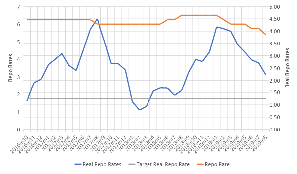 Between May 2018 and December 2018, the real repo rate averaged 2.8 per cent in contrast with 3.3 per cent since January 2019.