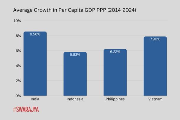 Between the 2014 and 2025, it traversed the entire range from low HDI to high HDI today. The most notable result is that these wins are resulting in faster per capita PPP GDP growth rate - not just benchmarked against prior Indian performance, but better than the ASEAN,equal to or better even than China at this income level.