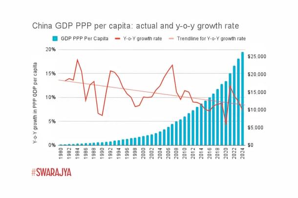 Note that this is per capita purchasing power growth. This is distinct from the general GDP growth data in that it depends inversely on two parameters - population growth and inflation. While India has seen higher real GDP growth rates, the combination of lower population growth - Indian total fertility rate (TFR) is now below replacement rate - and lower inflation boosted per-capita purchasing power. This accelerating trend is even more visible in this chart: