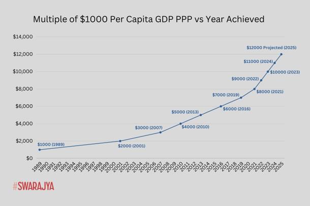 While it took India thirteen years to go from $1000 to $2000 in per capita PPP GDP, it took a year to cover thousand dollar increments from $8050 per capita PPP GDP in 2021 to $12000 in 2025.
