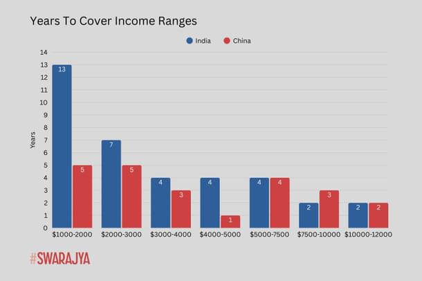 In effect, since hitting $7500 per capita PPP GDP, India has shown faster annual growth than China in this measure. Viewed in another way, India has shown at-par or better rate of traversal of income ranges as it has grown richer than China has, while the latter performed far better at lower income ranges:
