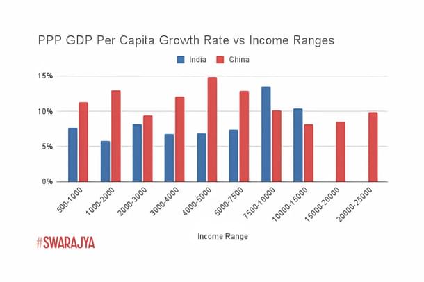 The above data presents a fascinating picture when compared against the performance of China across this same income range. Let us take a look at their growth picture first: