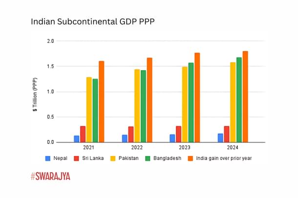 India adds 5 Sri Lankas or approximately 1.1x to 1.2x Bangladesh or Pakistanis economies to its economy every year. Note that the Indian data is the incremental GDP added each year. For all others, it is the total size of their economies.