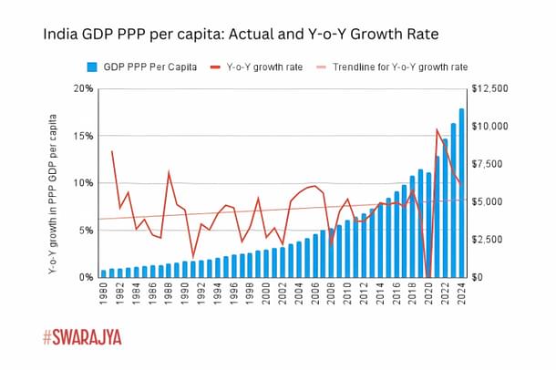 An implicit message in the above visual progression is that Indian per capita PPP GDP growth has shown an accelerating trend. This is more easily seen in the following figure: