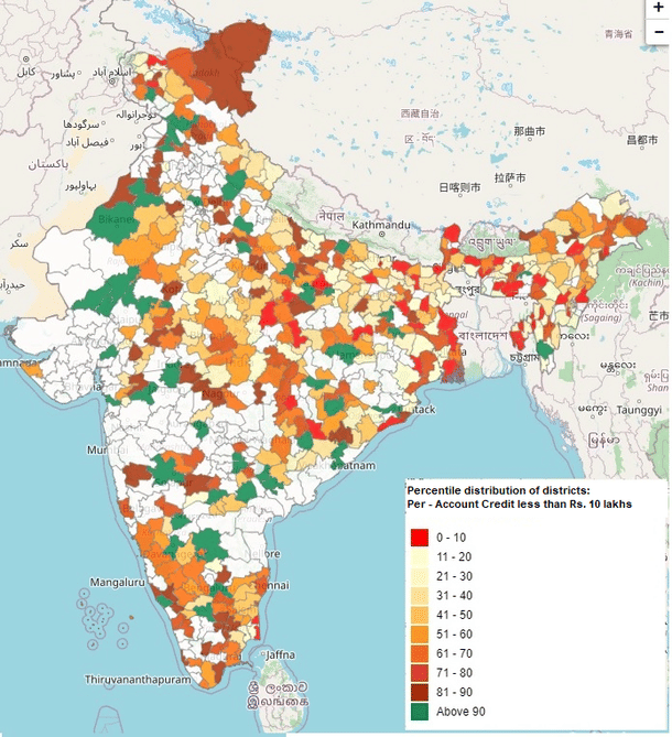 Of India’s 705 districts, 475, nearly 70 per cent have a per-account credit in manufacturing sector of less than Rs. 10 lakhs (Snapshot map 1).