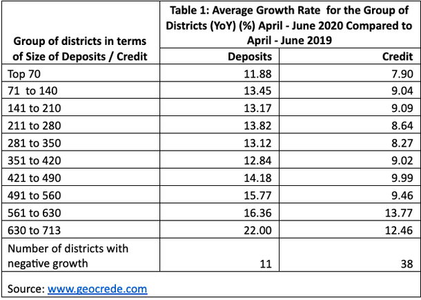 We see that across states, most districts have registered reasonable growth both in terms of credit and deposit. This could be the result of the credit enhancement programme initiated by the Central government and the increased transfer of funds to Jan Dhan accounts and other beneficiary accounts (table 1).